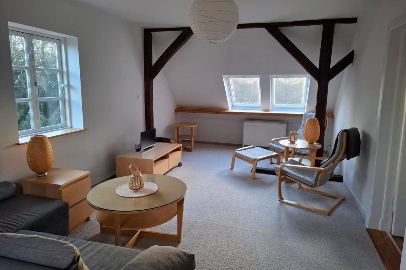 Lichtdurchfluteter Wohnbereich: Entspannen Sie in einem großzügigen Wohnzimmer mit gemütlicher Sofalandschaft, stilvollen Holzmöbeln und echtem Gebälk, das eine warme Wohlfühlatmosphäre schafft.
